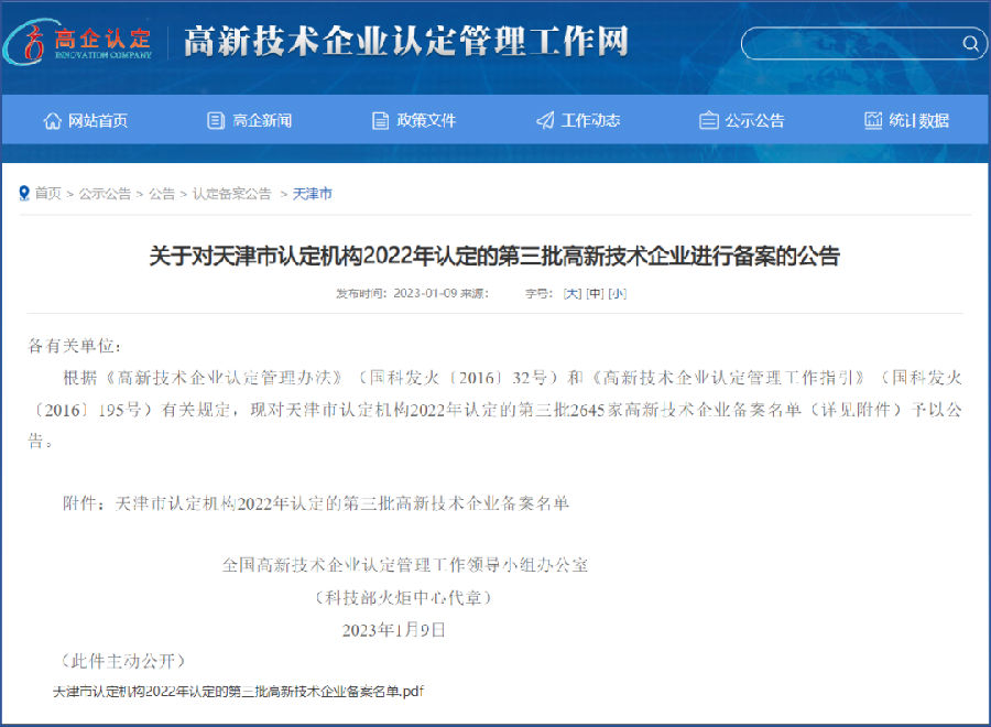 近日,國家科技部發布了《關于對天津市認定機構2022年認定的第三批高新技術企業進行備案的公告》,公司成功邁入國家高新技術企業行列!